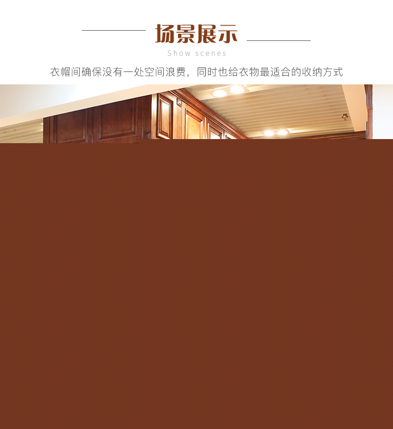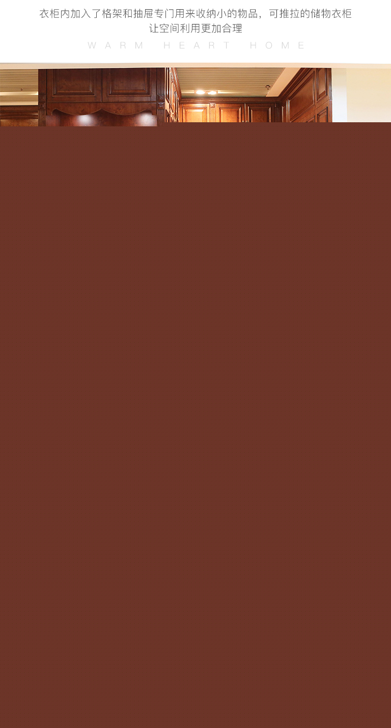 | 細節(jié)描述 | 衣帽間確保沒有一處空間浪費,同時也給衣物最適合的收納方式。衣柜內(nèi)加入了格架和抽屜專門用來收納小的物品,可推拉的儲物衣柜讓空間利用更加合理,軟包護墻板和鏡子,舒適美觀,使用安全 ,使整體空間裝飾效果明顯,方便保養(yǎng)維護。漫步其中,每一寸空間都擁有無論倫比的精致與奢華。 |