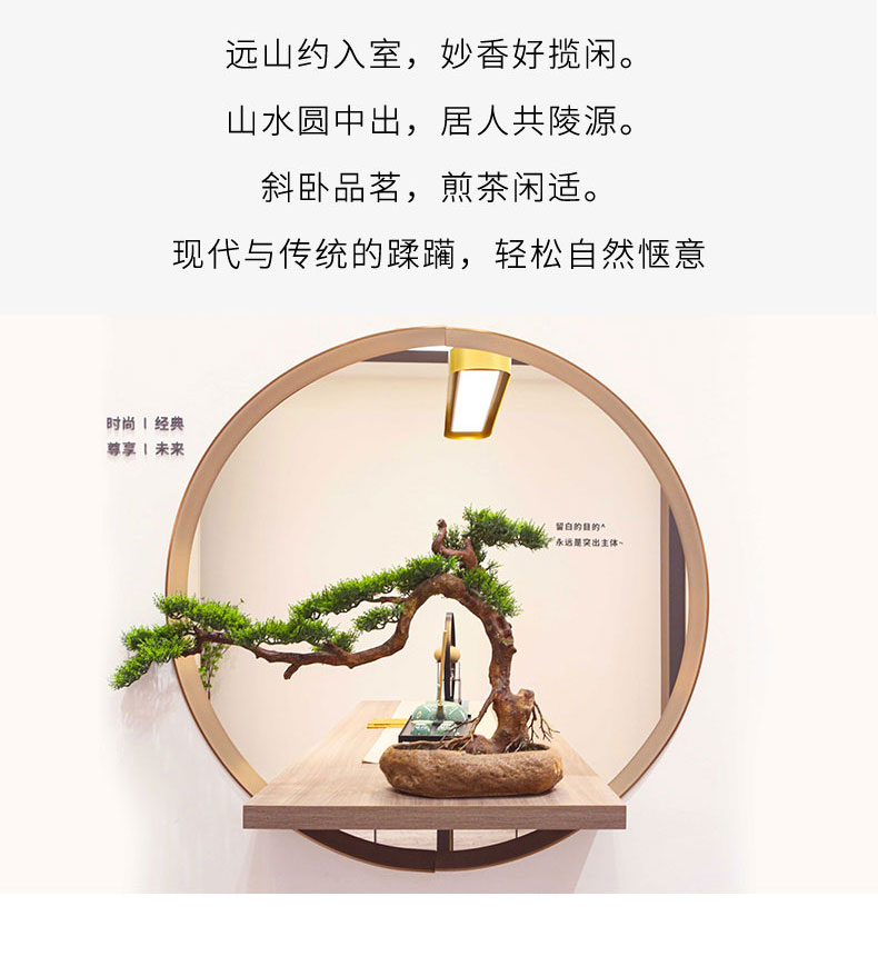 遠(yuǎn)山約入室,妙香好攬閑。山水圓中出,居人共陵源。斜臥品茗,煎茶閑適。現(xiàn)代與傳統(tǒng)的蹂躪,輕松自然愜意