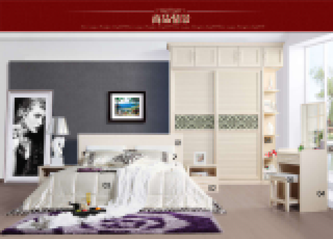 雙人床*1件、床墊*1件、床頭柜*2件、衣柜內(nèi)推拉門*2件、內(nèi)推拉門衣柜柜體*1件、梳妝臺(tái)*1件、梳妝凳*1件、單門頂柜*1件、對(duì)開門頂柜*2件、角柜*1件、內(nèi)推拉門衣柜外框*1件