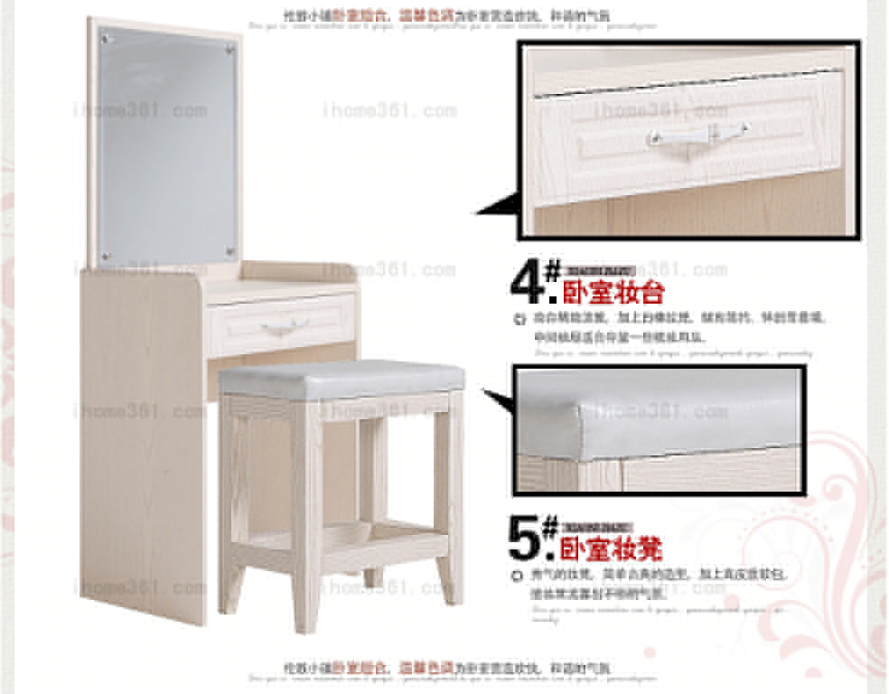 床的床頭采用優(yōu)質(zhì)珍珠粉皮,質(zhì)感細(xì)膩,柔然舒服,環(huán)保不變形;床頭柜分兩種,雙屜、上空格下抽屜,使床頭柜儲(chǔ)存多樣;床尾柜體分區(qū)合理,配上古典懷舊的白橡紋理,更顯時(shí)尚感;妝臺(tái)精致淡雅,加上白橡紋理,賦有簡(jiǎn)約、古典的造型;妝凳以秀氣的形象與妝臺(tái)相搭配,使他們流露出不俗的氣質(zhì);衣柜則融合了西方的古典風(fēng)格和東方的現(xiàn)代神韻,儲(chǔ)存功能齊全、分區(qū)明確。